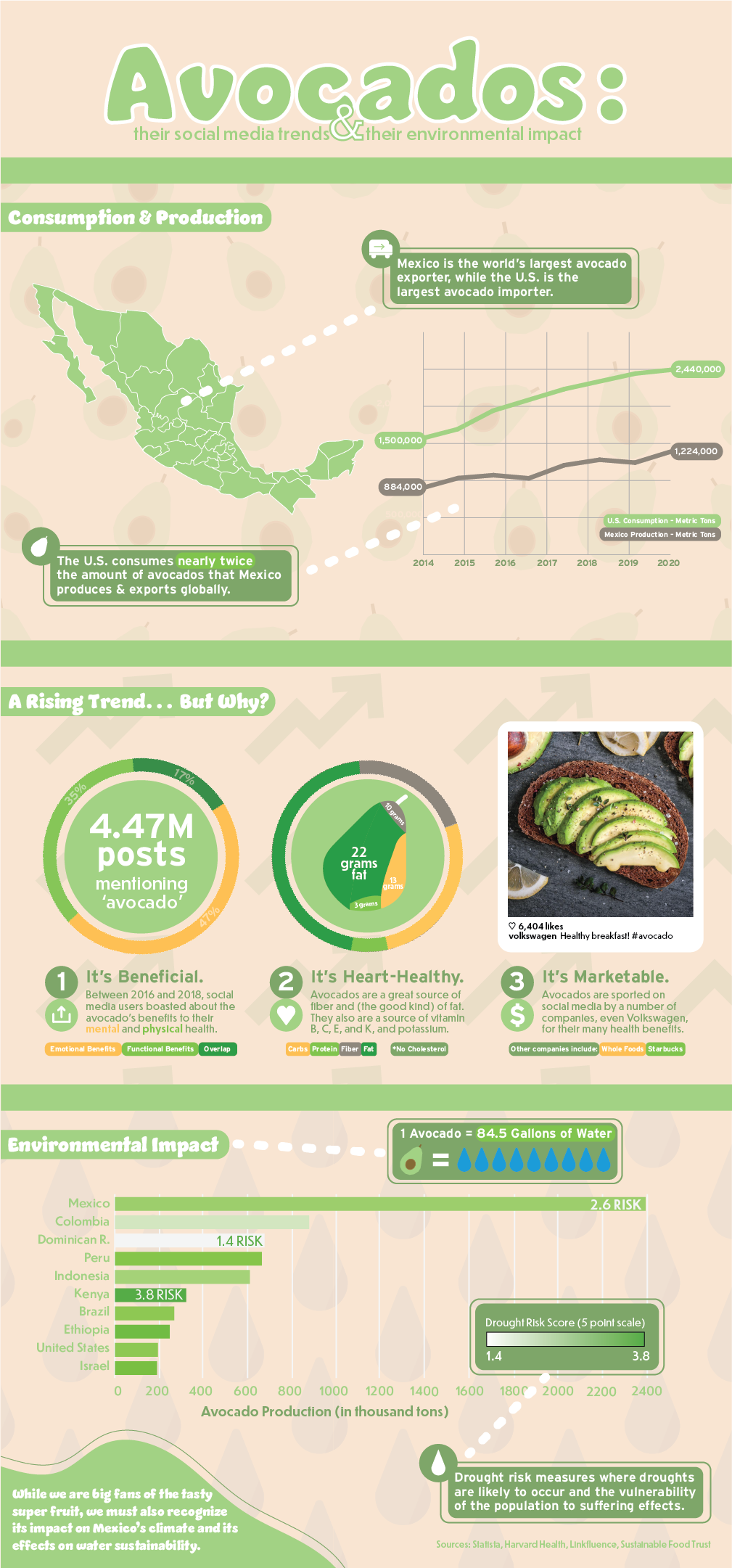 The avocado infographic details the story of how avocados grew as a social trend. The graphic describes the rise of avocado consumption, the social media trends over the years, and how avocado production dangerously impacts water sustainability. Data from peer-reviewed sources is included and is referenced at the bottom of the graphic.