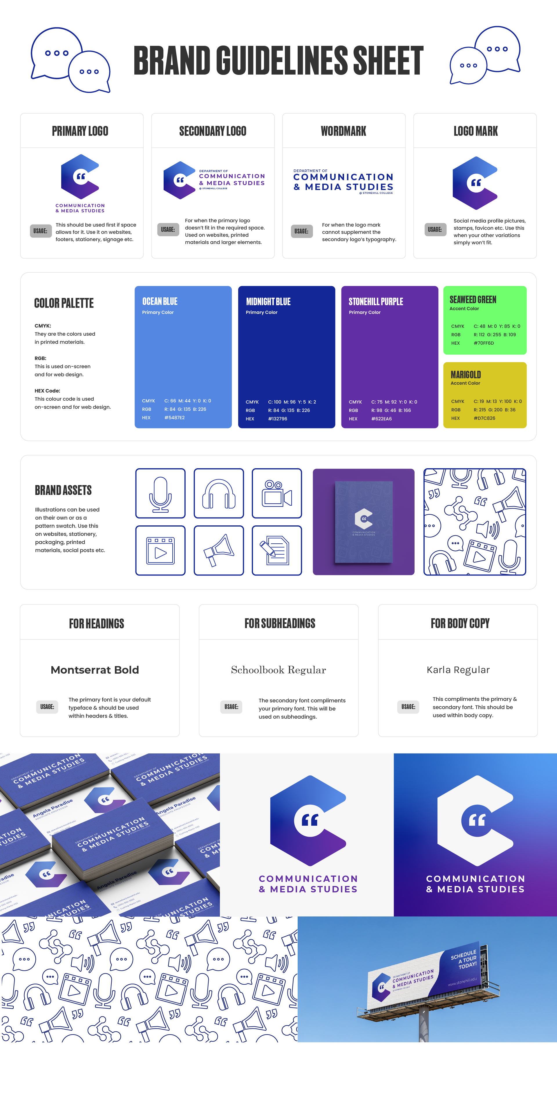 The Communication & Media Studies department at Stonehill College sought a cohesive brand and visual identity to create cohesive marketing materials. The proposed brand identity includes an adaptable logo suite, a comprehensive font suite and color palette, personalized brand assets, and social media plans.