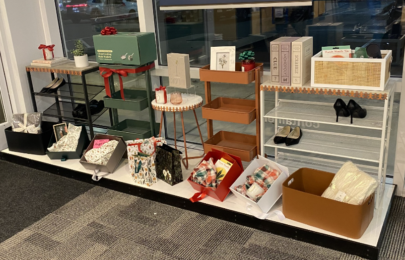 With the holiday season underway, I was eager to switch out the window display to something festive and inspiring. Using several gift boxes, tissue paper, and products merchandised in our holiday shop, I propped out the plinth with fresh holiday finds. The gift box displays were meant to motivate shoppers to get excited with the endless possibilities of holiday wrapping our stocking stuffers. I went an extra step and used some velvet ribbon to display some of our products decked out with bows and unique ribbon, all with the intent of making the holidays more jolly and fun!