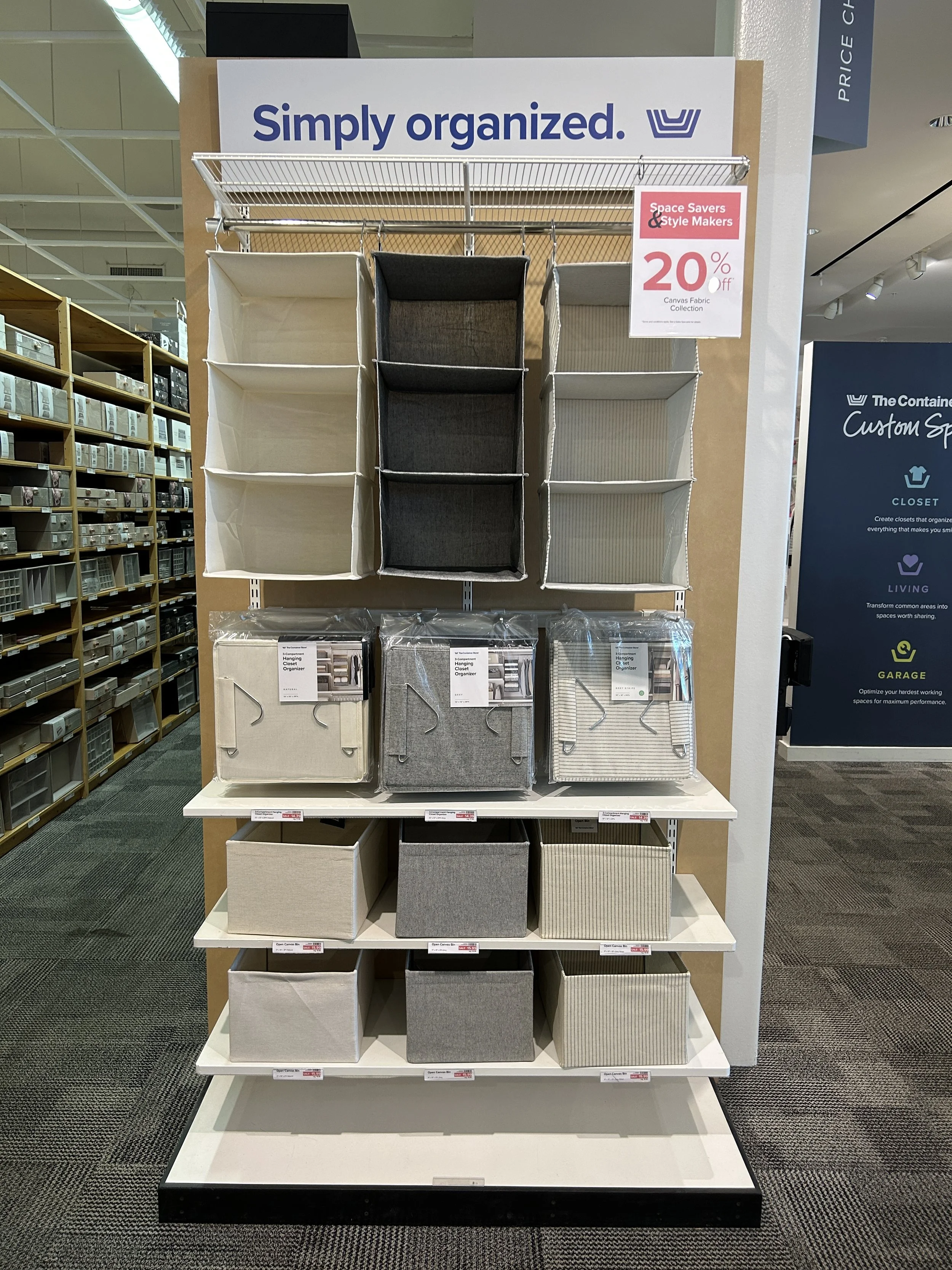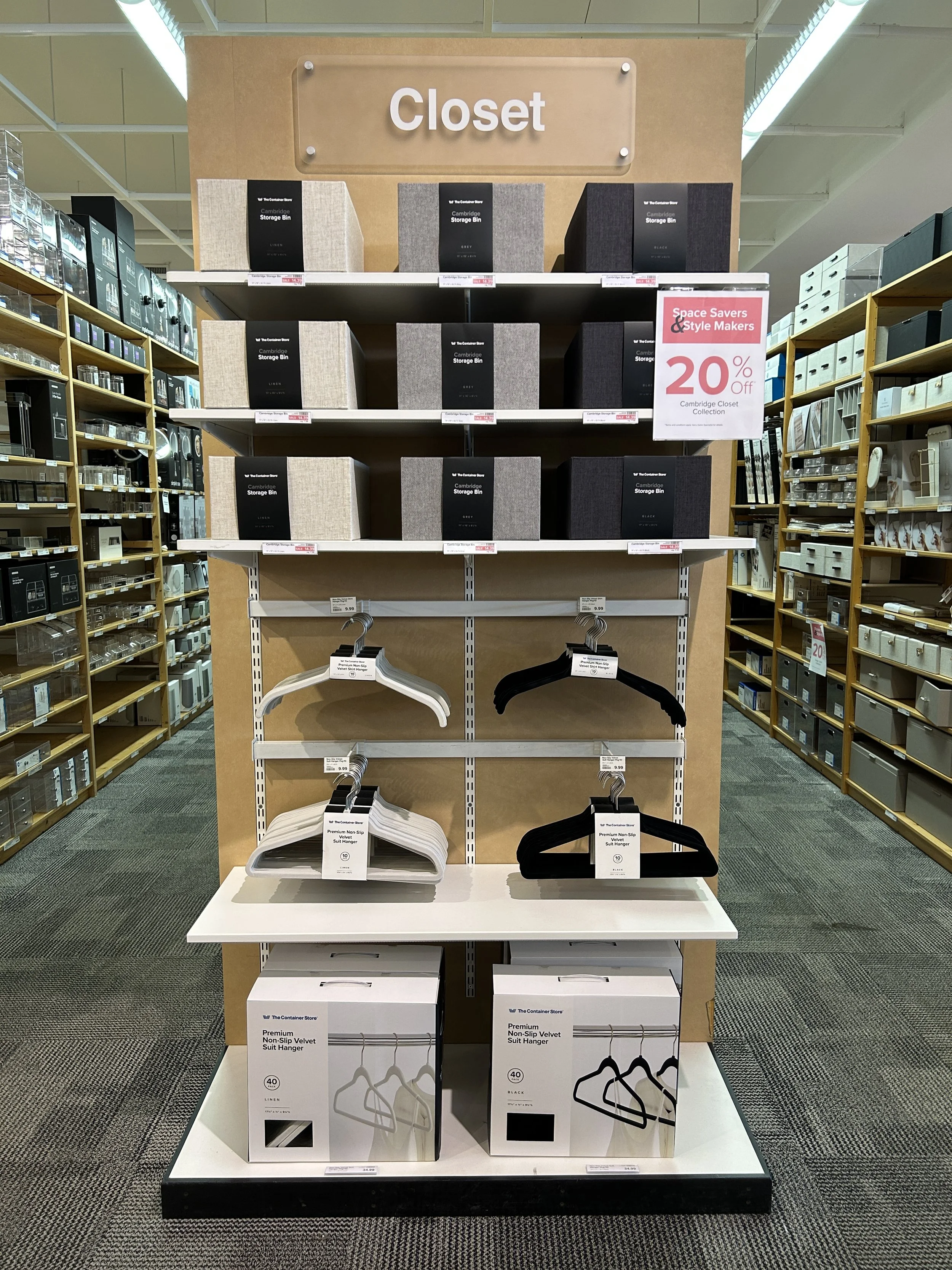 Coinciding with the “Space Makers and Style Makers” 20% off sale on various product lines across departments, I merchandised two headers in the closet department with two different collections that were on sale: Cambridge and Canvas Fabric. Both collections were at a fantastic price point and were perfect for shoppers looking to refresh and organize their closet with fresh products.