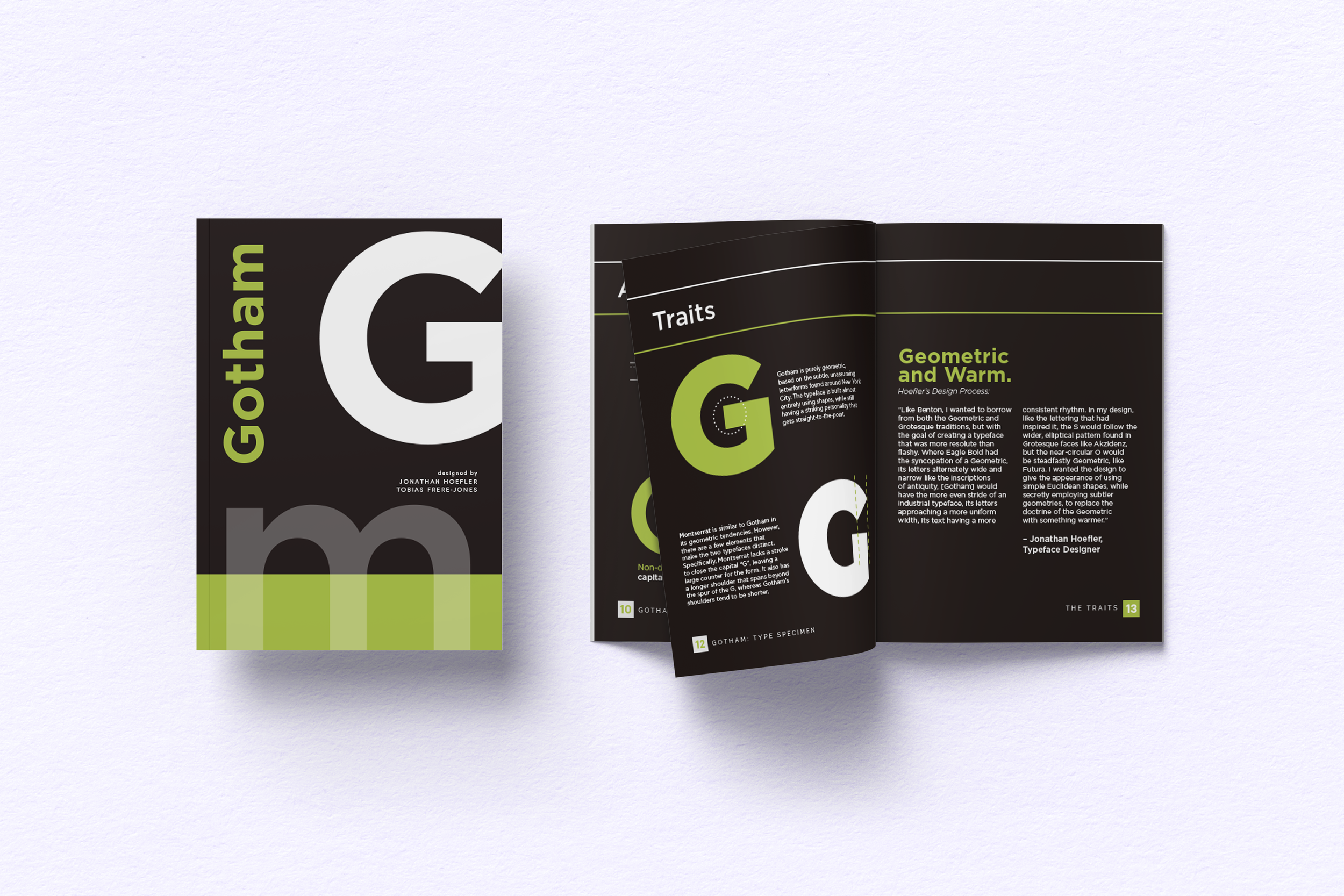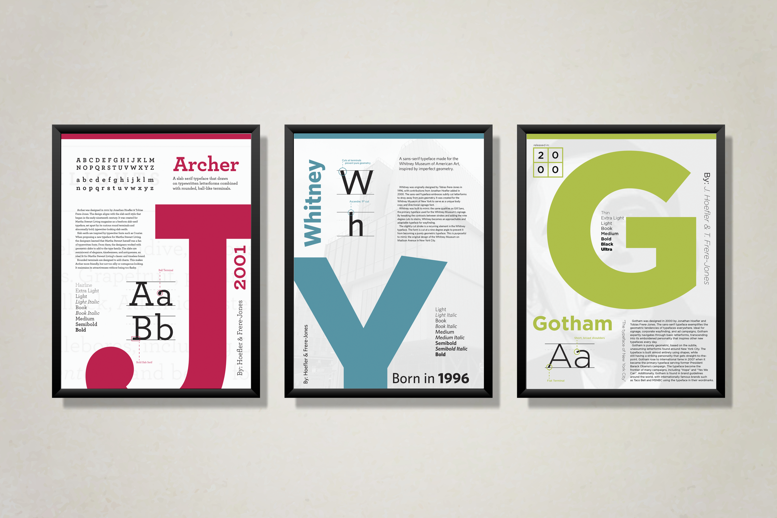 This series showcases the style and elegance of three different typefaces designed by type designers Jonathan Hoefler and Tobias Frere-Jones. Each typeface booklet explores the decorative elements used to build each typeface and examines its usage in real-life applications. Each booklet is accompanied by a specimen poster that condenses the information provided in the booklet into one medium.